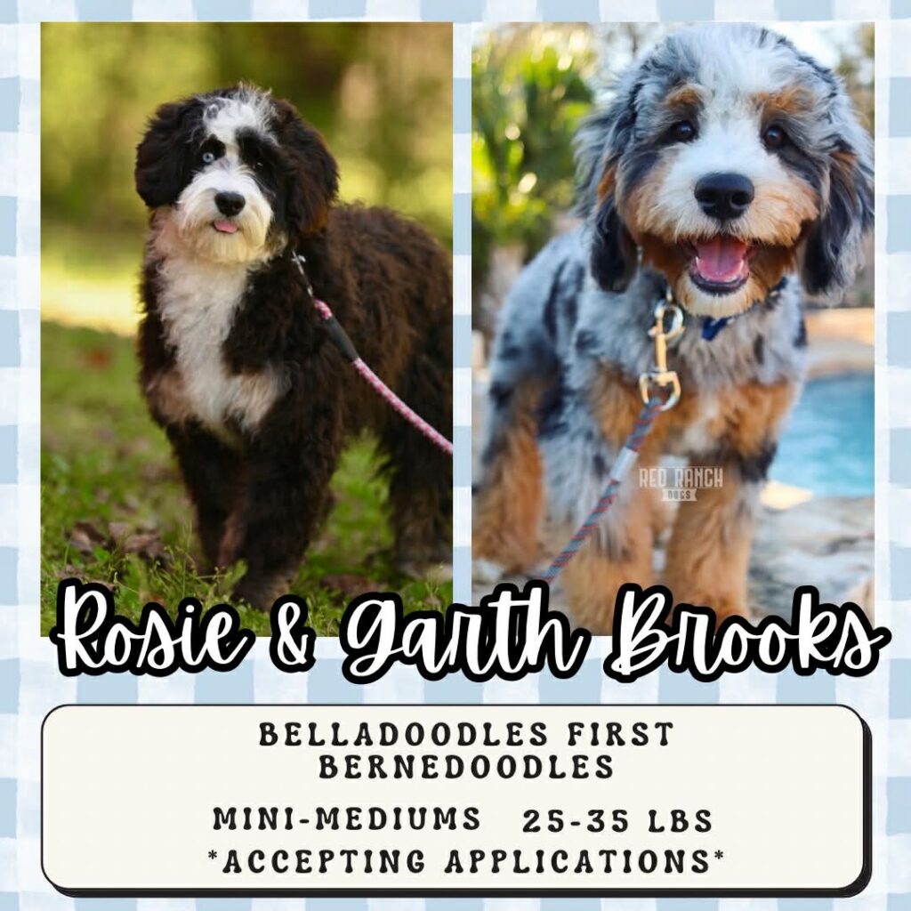 Mini Multi-Gen Bernedoodles from Rosie & Garth Brooks are the sweetest little combination of beauty, brains, and heart. Expected to mature around 20–25 pounds, these babies are the perfect “just right” size — big enough for adventure, small enough for snuggles on the couch. Their soft, wavy coats give them that classic teddy-bear look while staying low-shedding and family friendly.